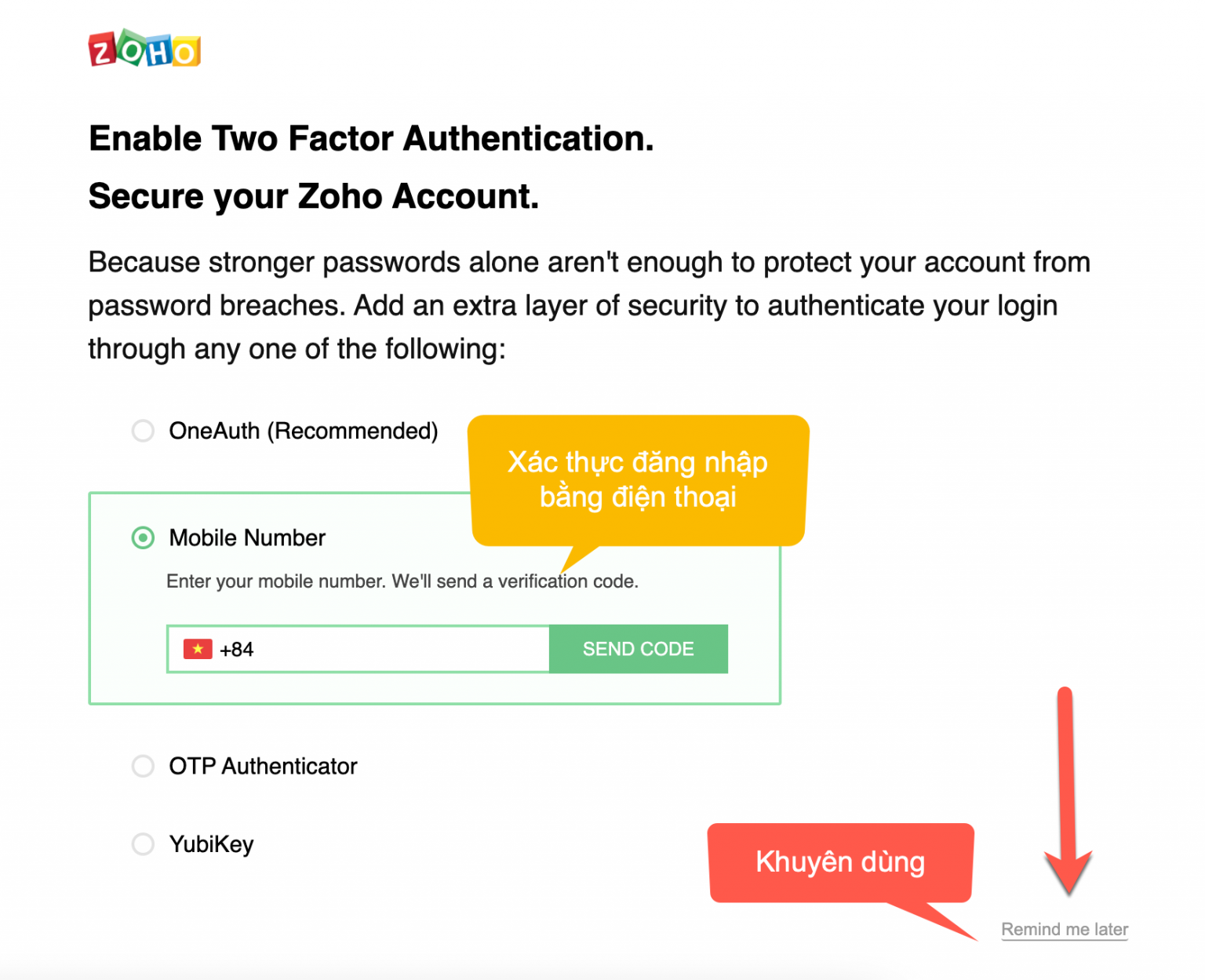 “Remind me later” nằm ở góc phải màn hình. (Là chức năng bảo mật thông thường, dễ dàng sử dụng)