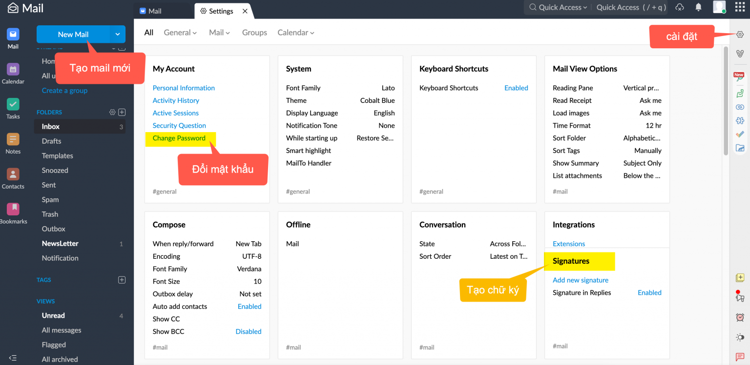 Zoho mail còn có ngôn ngữ tiếng Việt, bạn có thể tự khám phá và lựa chọn ngôn ngữ phù hợp (mỗi lần đăng nhập trình duyệt, hệ thống sẽ tự động hiện đề xuất ngôn ngữ Tiếng Việt dể bạn chọn.